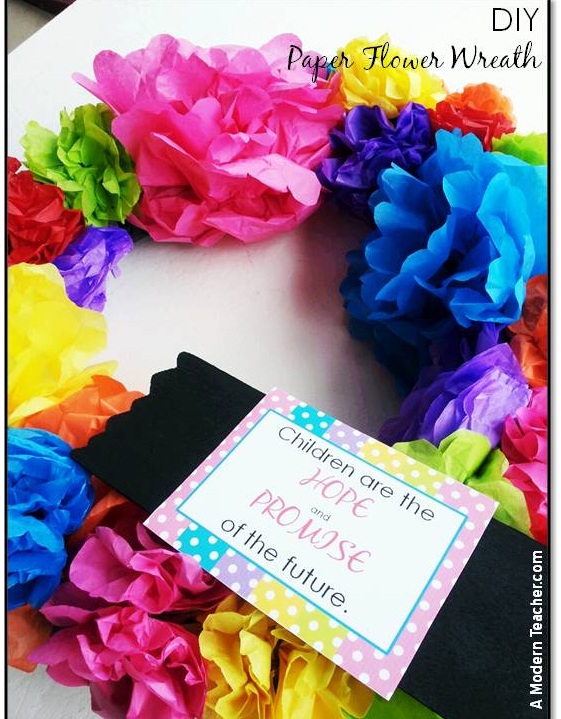 If you are decorating next year with the rainbow theme your classroom will be full of color, brightness, and warmth. How fun!  I had so many ideas on what to add to your classroom with this…it was tough to make a decision on just one project!  However, I really wanted to share with you something SUPER EASY and hardly any moola.  On to the project…. How To Make a Paper Flower Wreath